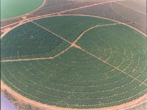 04 Equipamentos de pivôs central, com 100 ha cada, alimentados por um canal a céu aberto, que transporta água que recebe da adutora principal, estes pivôs tem aproximadamente 05 anos de uso, estão em pleno funcionamento com uma lamina de 10mm.